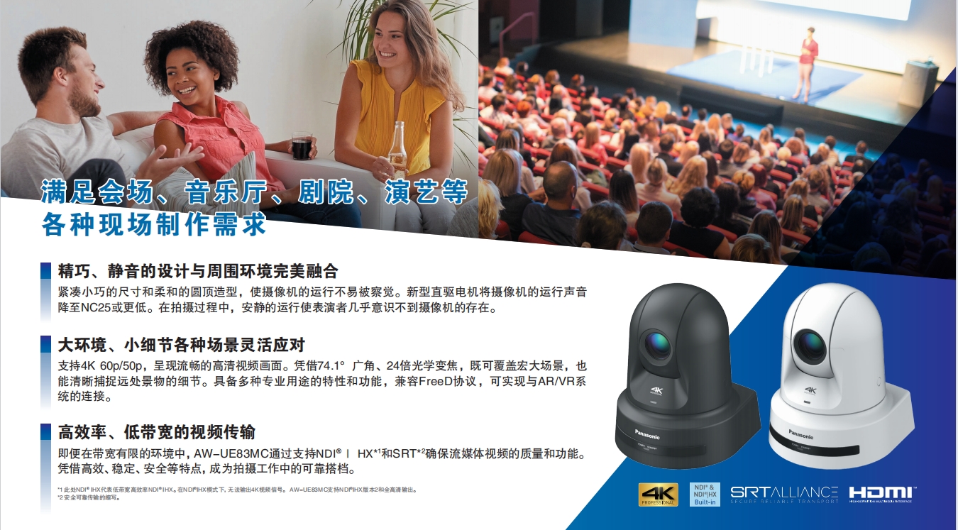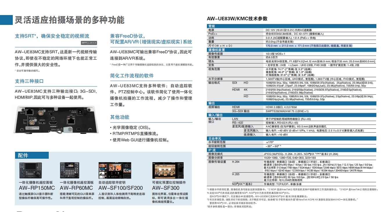 即便在帶寬有限的環(huán)境中,AW-UE83W/KMC通過支持NDI? HX2*1和SRT*2確保流媒體視頻的質(zhì)量和功能。