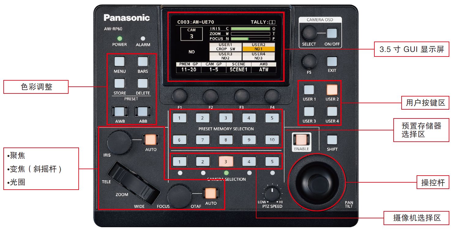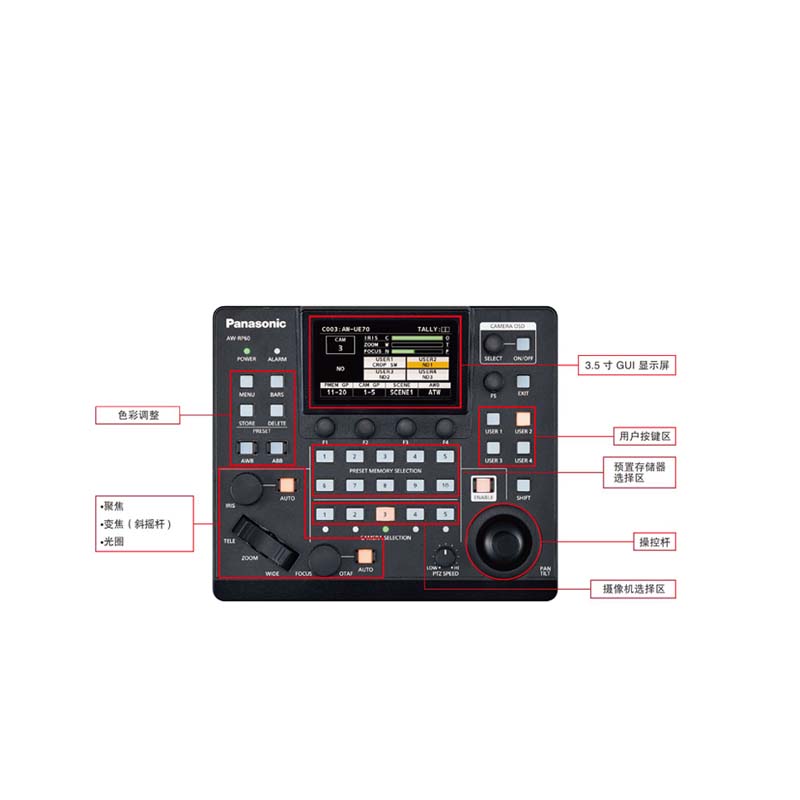 AW-RP60MC配備了3.5寸液晶顯示屏,提供一個(gè)GUI菜單,需要的信息一目了然,可快速直觀地控制攝像機(jī)。