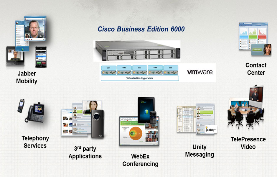 Cisco Business Edition 6000(BE6000)基于虛擬化技術,它將多個協作應用程序結合到一個高可用性的解決方案中,其隨企業需要不斷改善的活架構可幫助中型企業降低總擁有成本(TCO)并提高投資回報(ROI)。