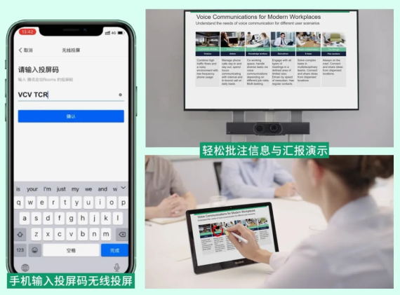 采用騰訊會議Rooms的投屏碼投屏,可將個人電腦/手機(jī)等設(shè)備內(nèi)容進(jìn)行無線投屏與批注,讓遠(yuǎn)端位置人員坐享無線輕松協(xié)作。