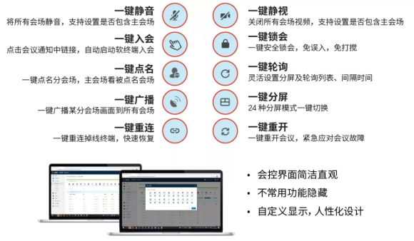 WeMeet(微視通)的10大一鍵操控功能,整合了Poly多年的專業會議保障經驗,可以滿足不同用戶復雜的會議管控需求。會議保障人員只需一鍵操作,即可輕松實現靜音靜像、會場點名、會場輪詢、廣播分會場、切換分屏顯示、重連掉線會場等。